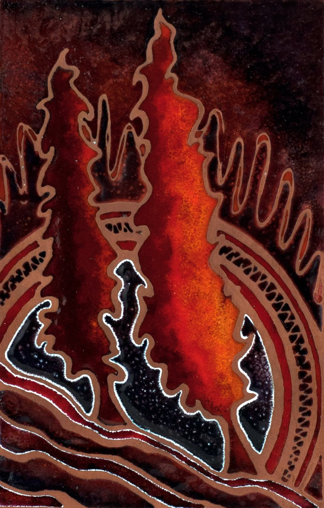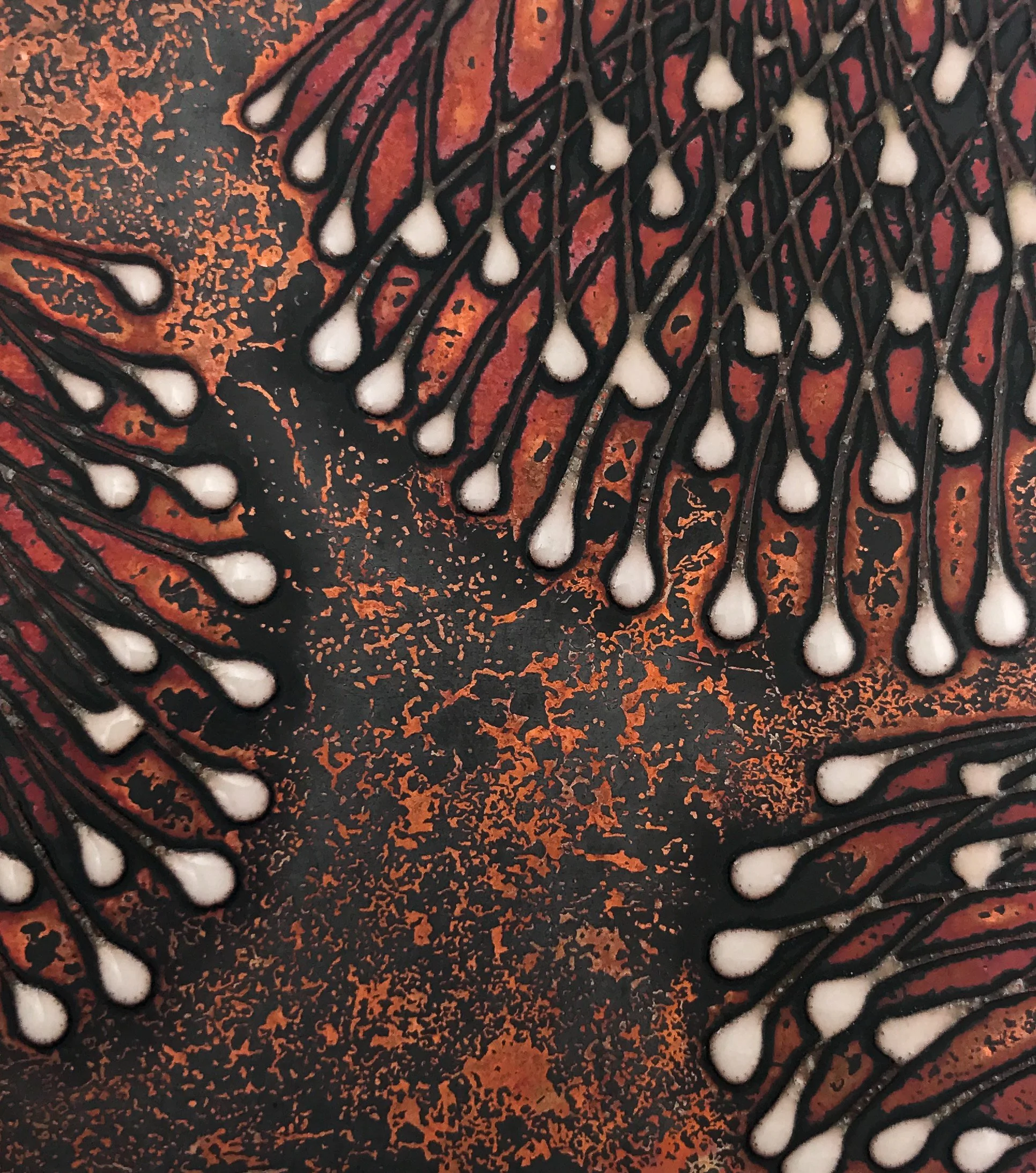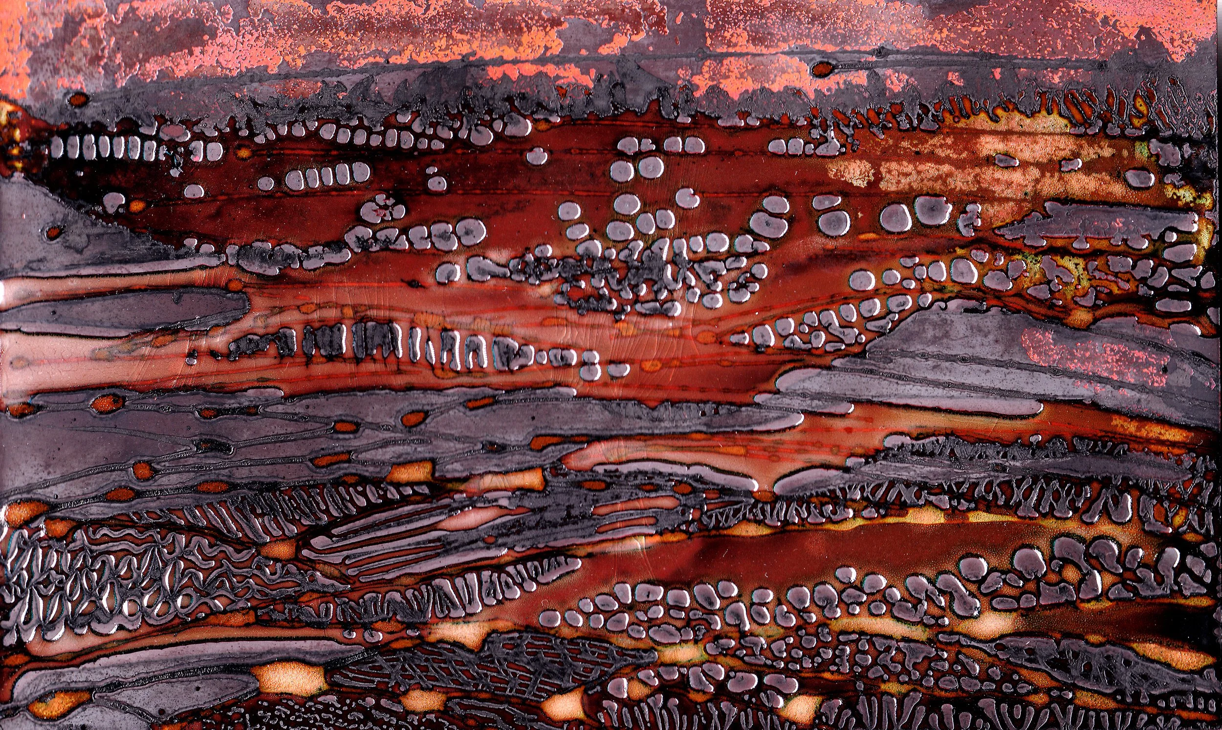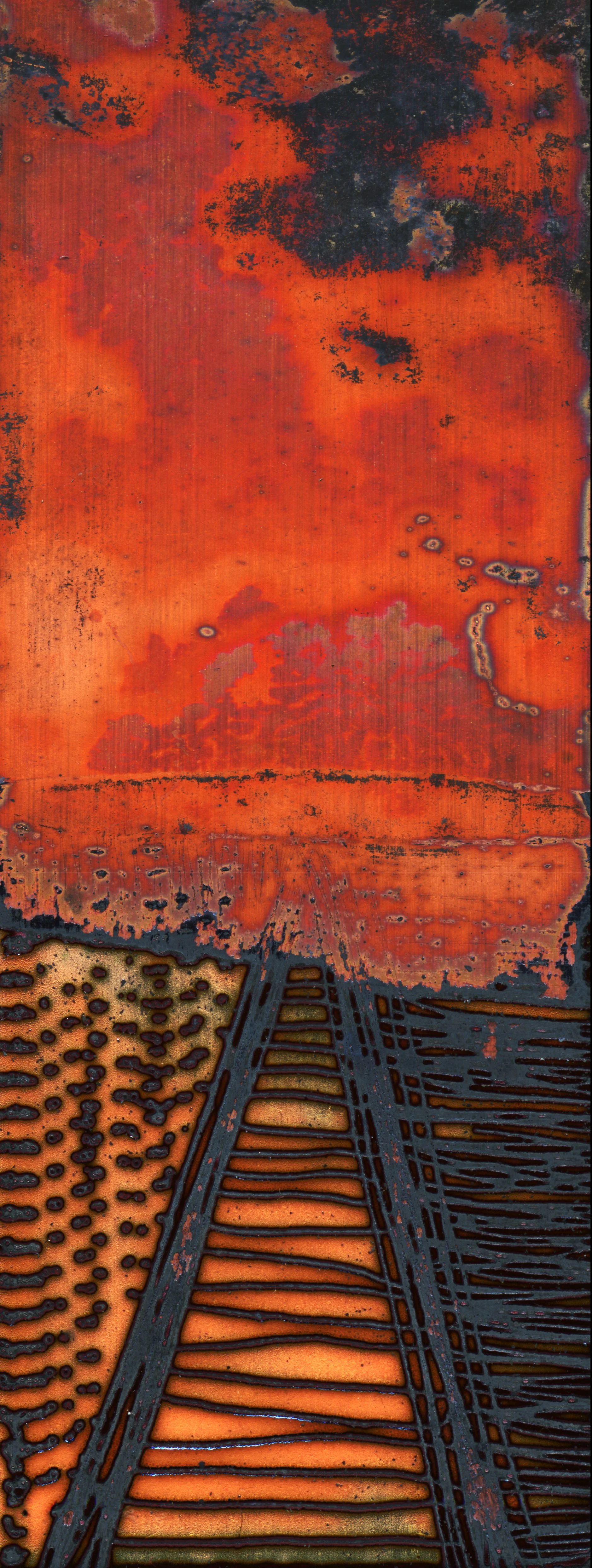 Many of the panels below were made using sgraffito, the drawing technique of scratching through a layer of enamel to reveal the metal or a lower layer of enamel. This technique makes it possible to draw very delicate lines, patterns, and textures. Other panels were created using extra fine tip squeeze bottles to apply lines of liquid enamel directly on the metal. While some panels require just 1 application of enamel and others up to 20, most were made with 3-6 successive layers, each layer requiring metal preparation, enamel application and drying, sgraffito, and finally, firing in the kiln.