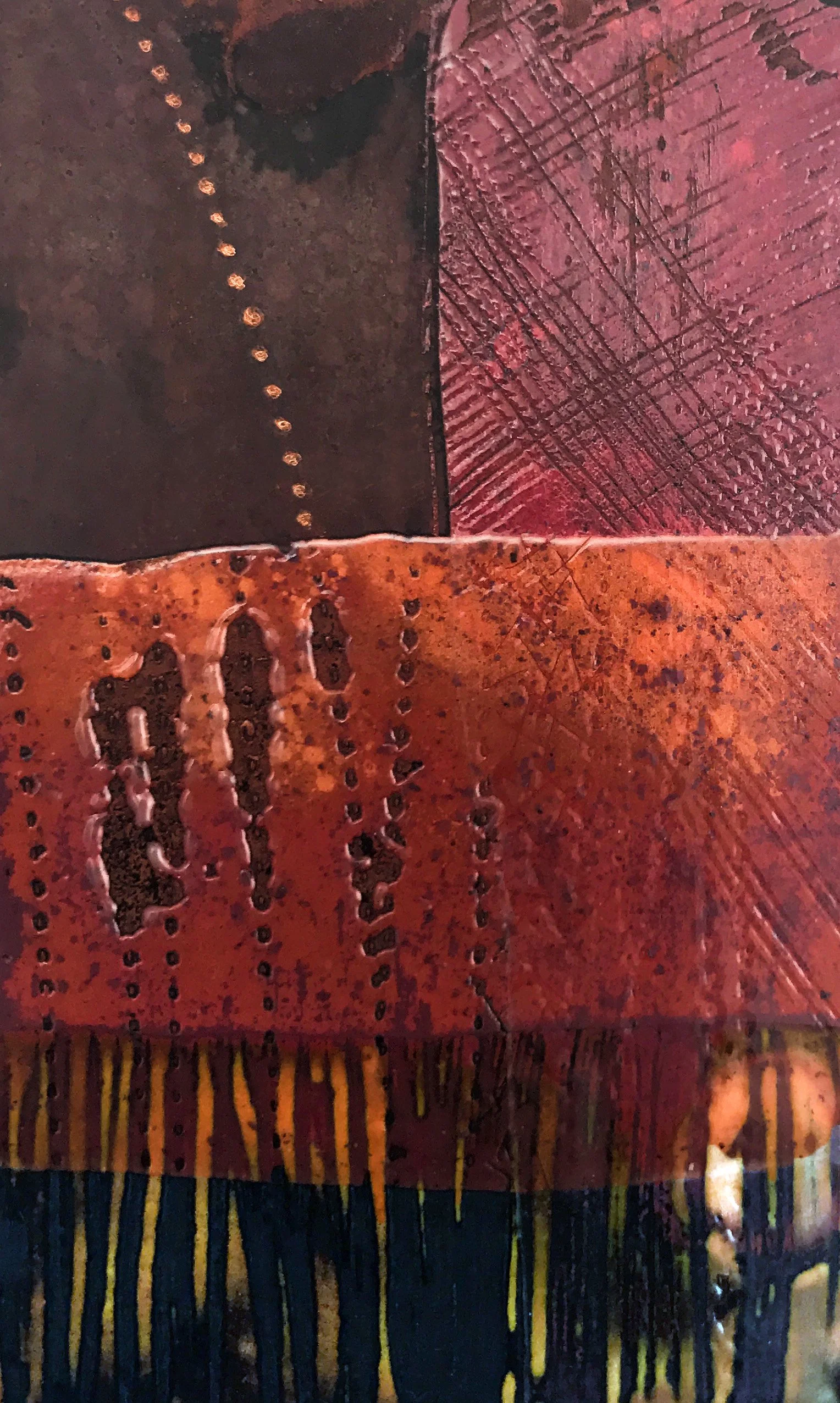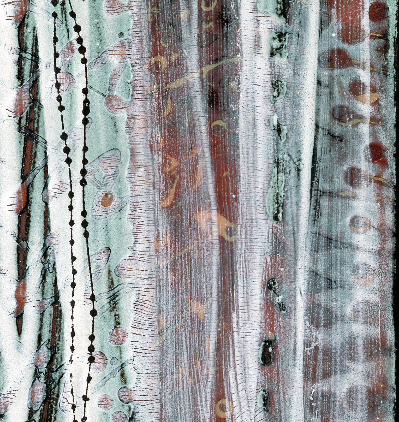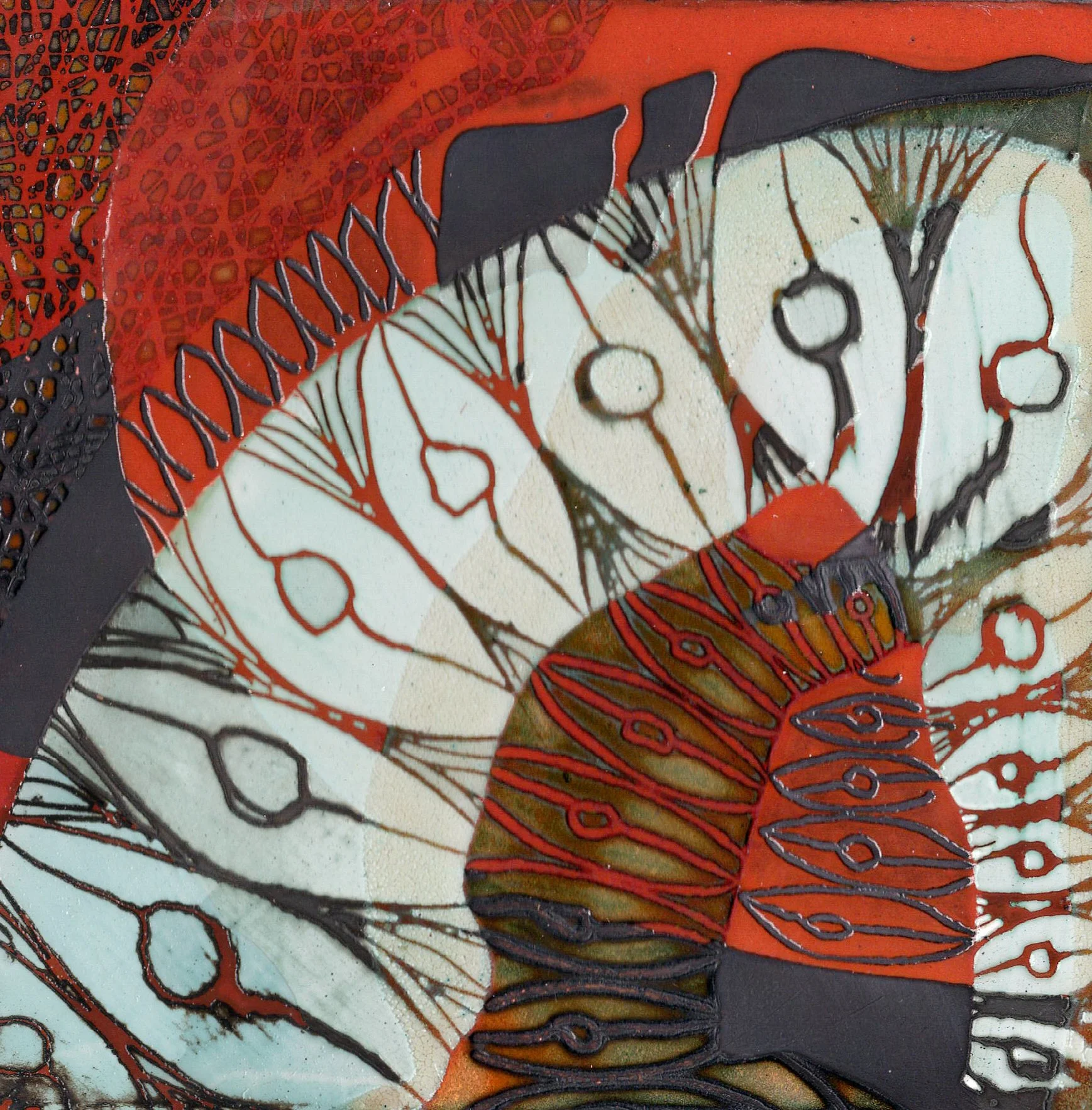 Many of the panels below were made using sgraffito, the drawing technique of scratching through a layer of enamel to reveal the metal or a lower layer of enamel. This technique makes it possible to draw very delicate lines, patterns, and textures. Other panels were created using extra fine tip squeeze bottles to apply lines of liquid enamel directly on the metal. While some panels require just 1 application of enamel and others up to 20, most were made with 3-6 successive layers, each layer requiring metal preparation, enamel application and drying, sgraffito, and finally, firing in the kiln.