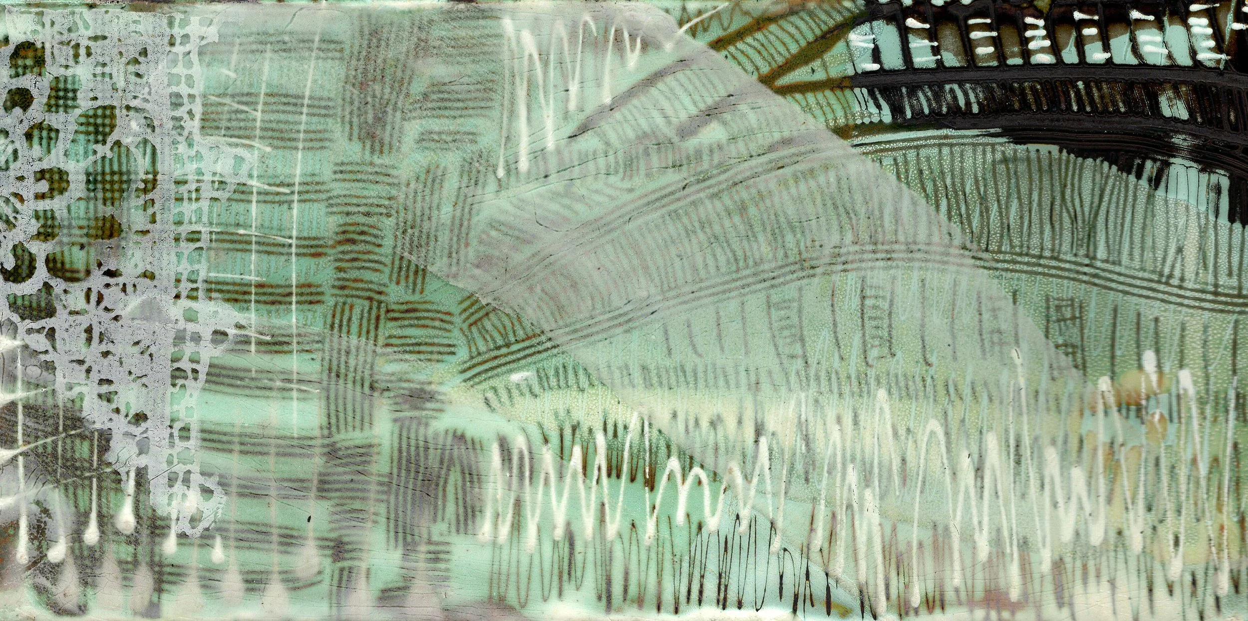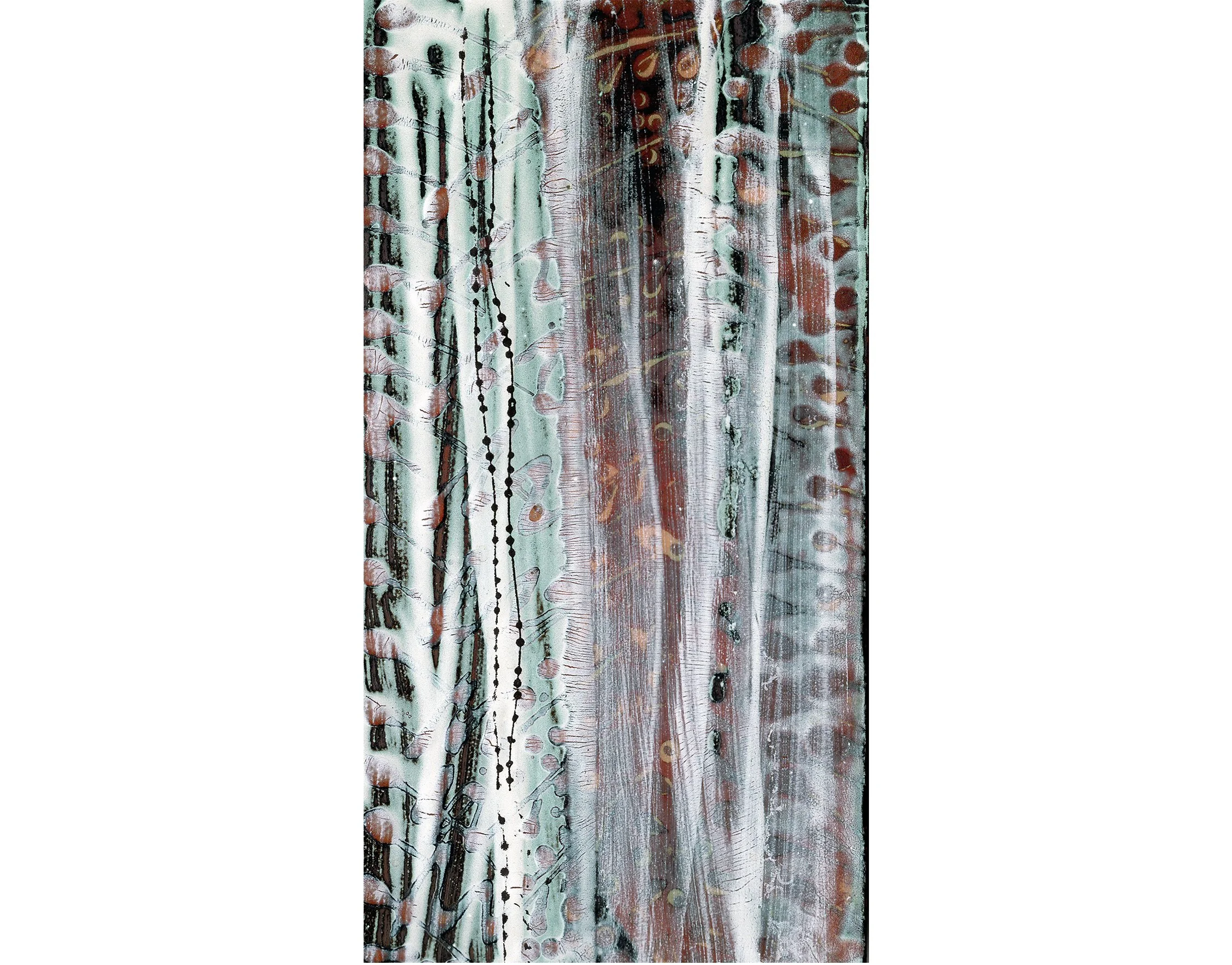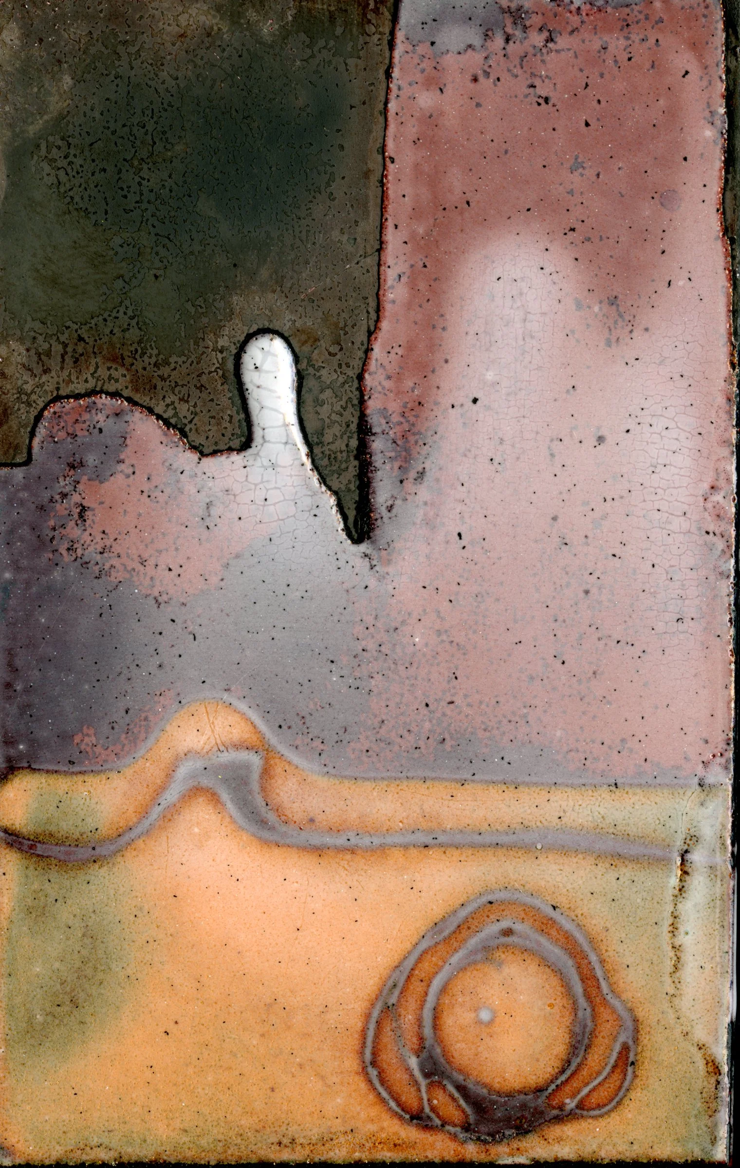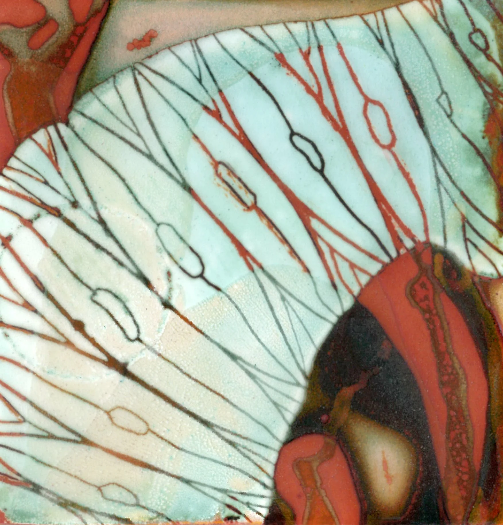 Many of the panels below were made using sgraffito, the drawing technique of scratching through a layer of enamel to reveal the metal or a lower layer of enamel. This technique makes it possible to draw very delicate lines, patterns, and textures. Other panels were created using extra fine tip squeeze bottles to apply lines of liquid enamel directly on the metal. While some panels require just 1 application of enamel and others up to 20, most were made with 3-6 successive layers, each layer requiring metal preparation, enamel application and drying, sgraffito, and finally, firing in the kiln.